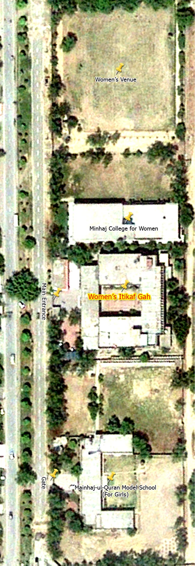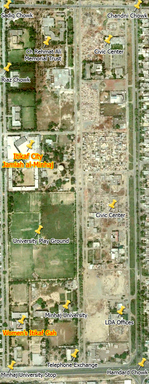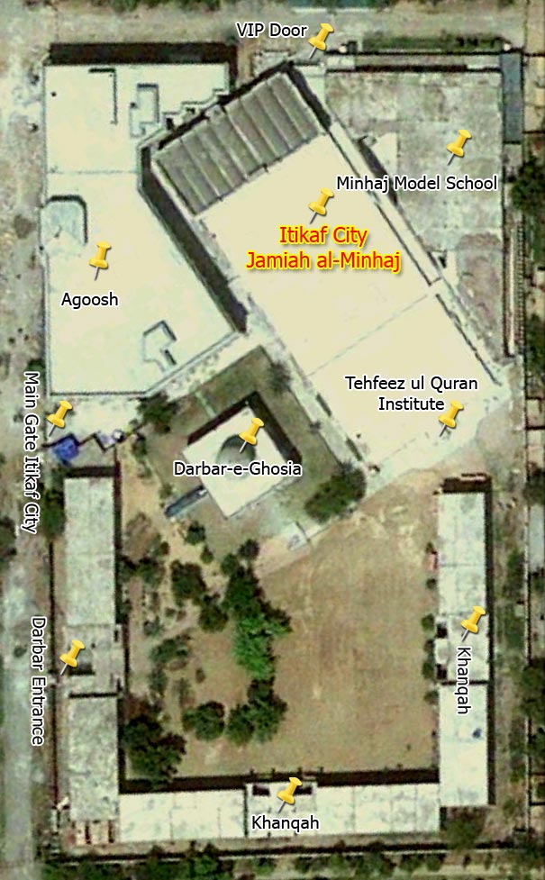 This map allows you to learn about the buildings within I`tikaf City. Here Jami`-ul-Minhaj, Minhaj-ul-Quran Model School, Tahfeez-ul-Quran Institute and buildings adjacent to Darbar Ghousiyah turn into I`tikaf City in the last ten days of Ramadan.
